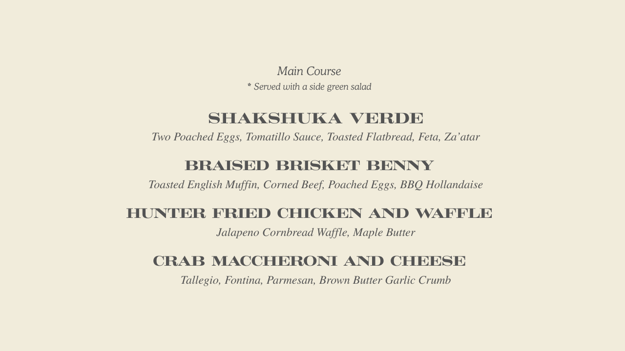 Mains come with a side green salad and a choice that'll take some deliberating. The Braised Brisket Benny — corned beef, poached eggs, BBQ hollandaise on a toasted English muffin — is rich and earned. The Hunter Fried Chicken and Waffle gets a jalapeño cornbread waffle and maple butter, which is the Hunter way of saying we don't do things halfway. For something a little more unexpected, the Crab Maccheroni and Cheese with taleggio, fontina, and brown butter garlic crumb is the kind of dish that makes the table go quiet for a moment.