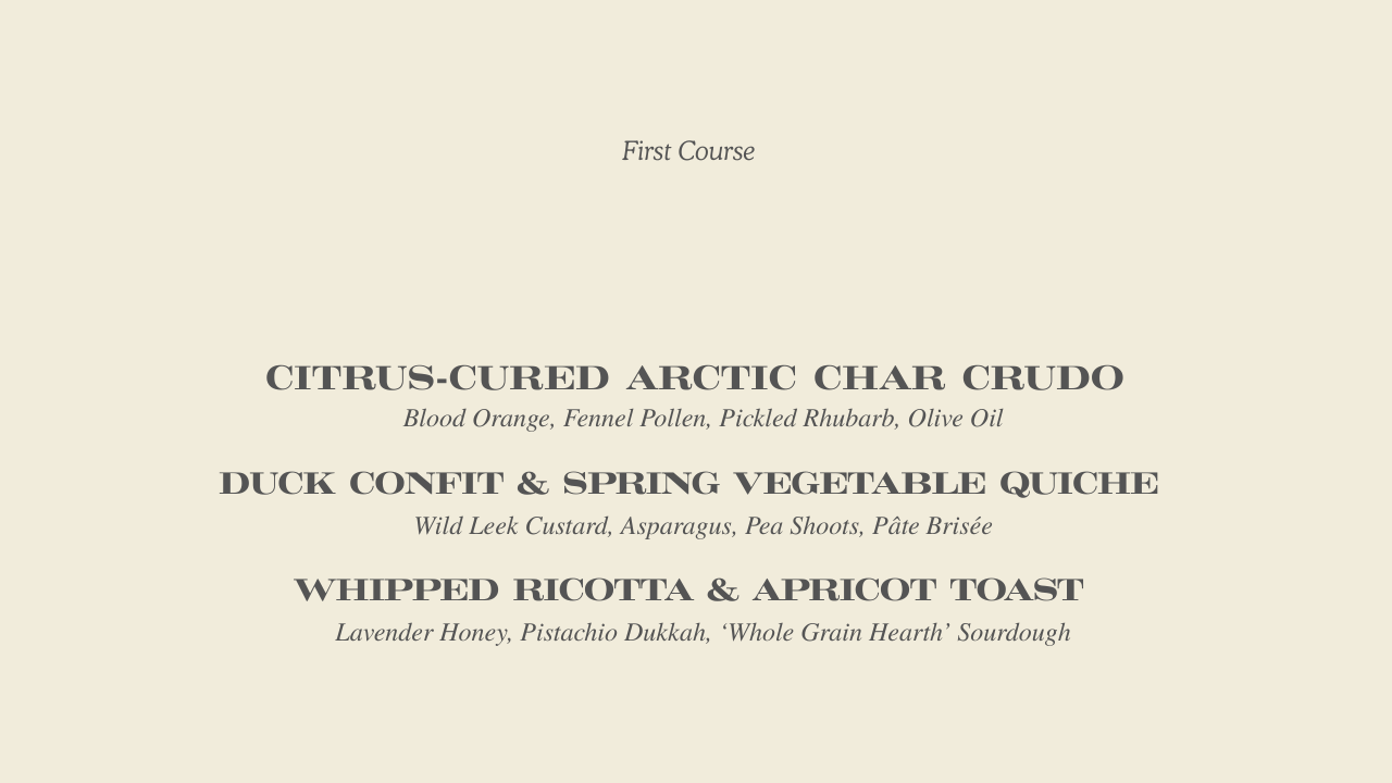 The first course sets the tone. Start with Citrus-Cured Arctic Char Crudo: blood orange, fennel pollen, pickled rhubarb, a drizzle of olive oil — bright and a little unexpected, the way a good morning should feel. Or go for the Duck Confit and Spring Vegetable Quiche, with wild leek custard and pâte brisée, which is exactly as serious as it sounds. If you'd rather ease in, the Whipped Ricotta and Apricot Toast on whole grain hearth sourdough with lavender honey and pistachio dukkah is the kind of thing you'll think about on the drive home.