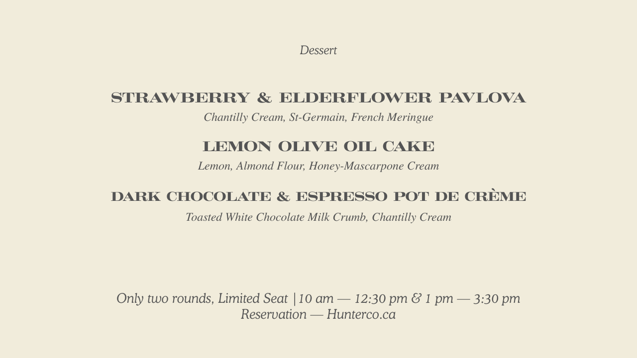Two courses at CA$40, three at CA$50. Two seatings: 10 AM to 12:30 PM and 1 to 3:30 PM. Seats are limited — they always go faster than expected.